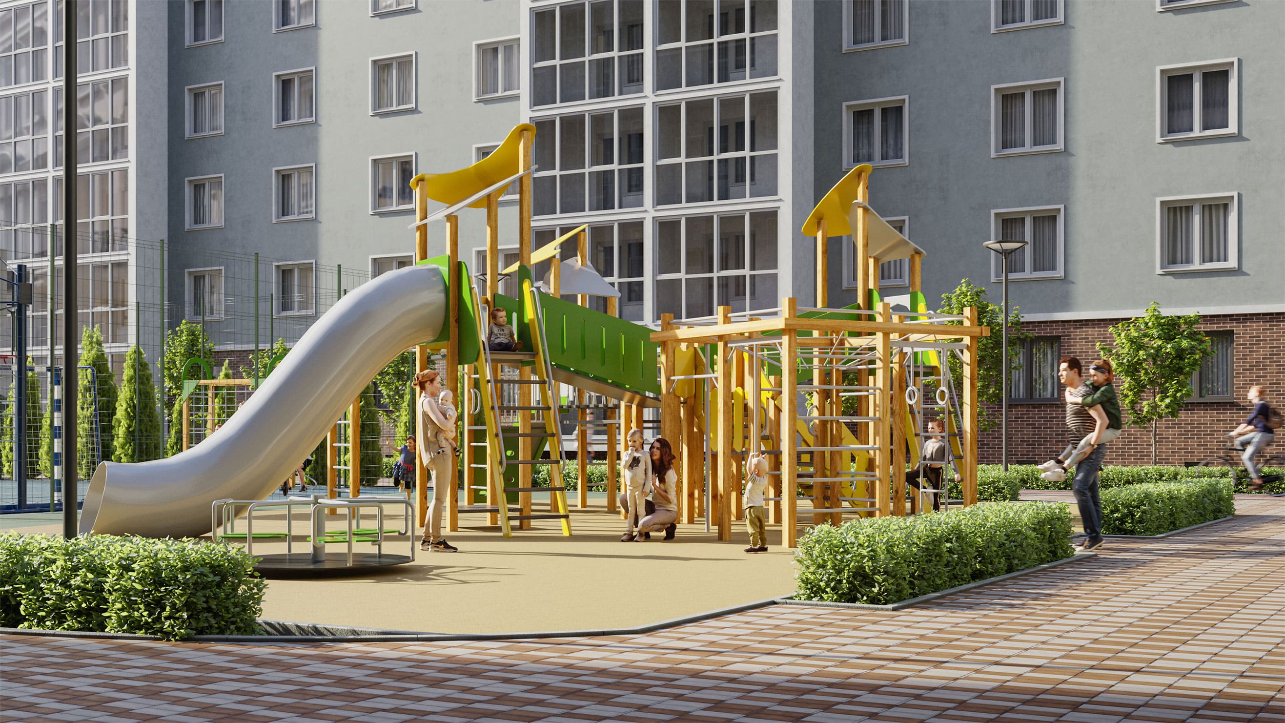 Дворы без машин, прогулочные зоны, разнообразные потоки движения. Детские площадки Традиционные для застройщика детские площадки в эко стилистике. Спортивные площадки разработаны в сотрудничестве с профессиональными спортсменами.