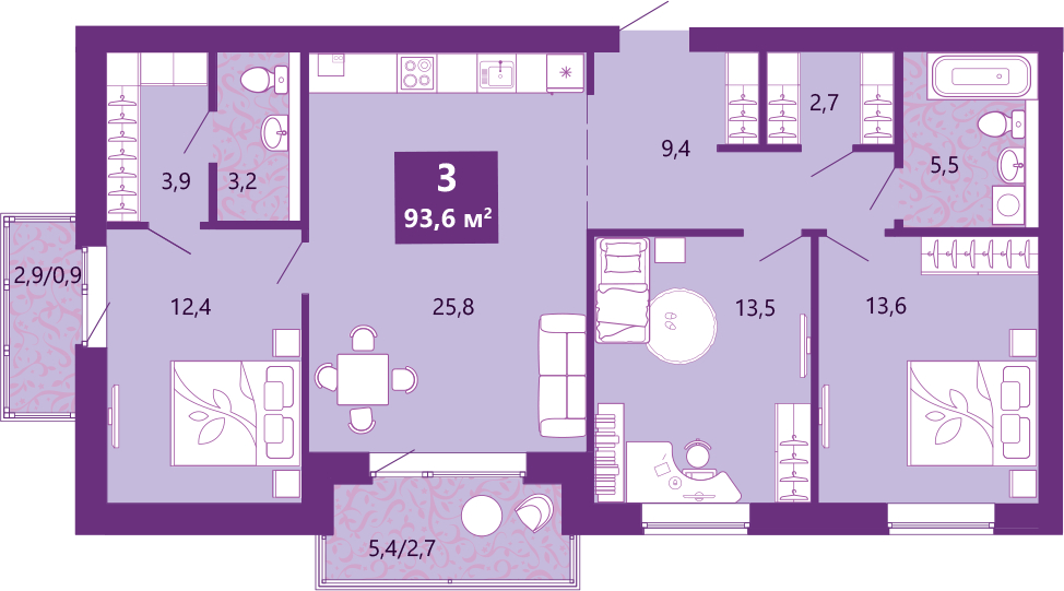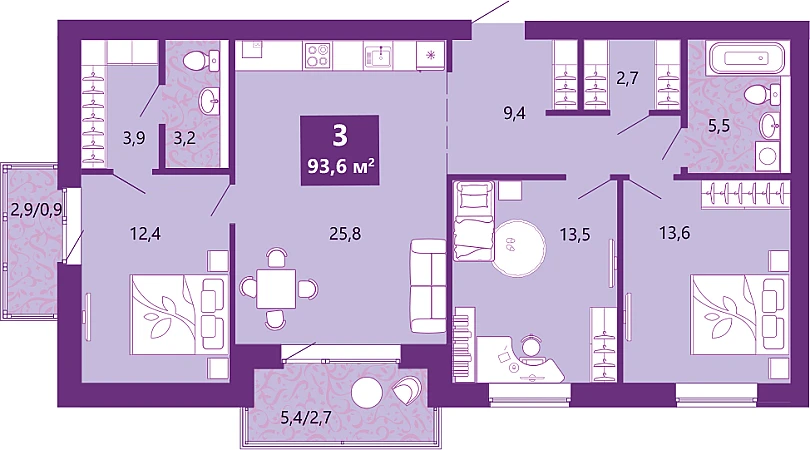3к квартира 95 м² в ЖК "Сиреневый бульвар"